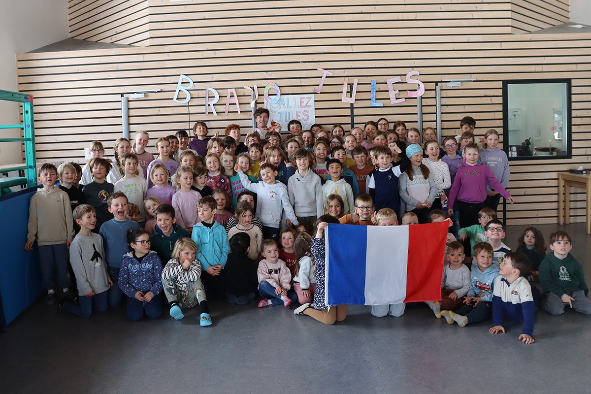 Merci Jules pour ta disponibilité et ta gentillesse ; cette rencontre restera sans nul doute gravée dans la mémoire des enfants et leur donnera peut‑être envie, à eux aussi, de décrocher des médailles.